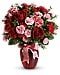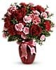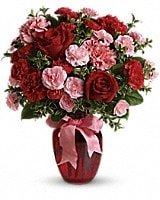 True romance will bloom brighter than ever when you surprise her with this dazzling bouquet of red roses, red carnations and other favorites in a chic ruby red vase. "Surprise" is the key word. That's when flowers mean the most.