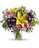 Sprinkle happiness on any occasion with this bright, beautiful bouquet! A cheerful blend of sunshiny lilies, pretty purple blooms and glowing greens in a classic cylinder, it makes any day feel fresh and fabulous!
