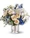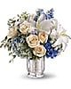 Spend a peaceful afternoon at the seaside with this breathtaking centerpiece. Lush blue hydrangea and delphinium evoke sea and sky, while creamy roses, white lilies and delicate Queen Anne's lace whisper of sand and sea foam. Presented in an antiqued Mercury Glass Vase, it's an elegant choice for weddings and showers.